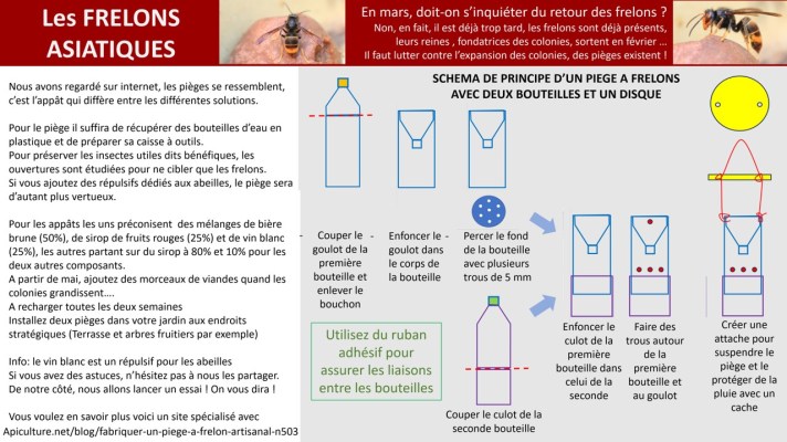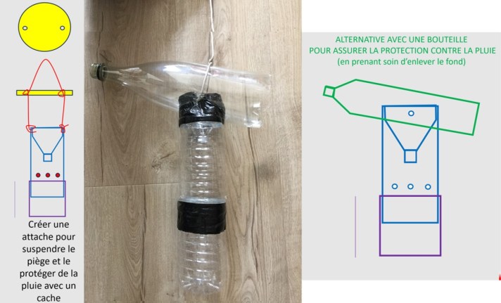 Quelqu’un parmi vous connaît-il une solution pour ne pas avoir (sinon le moins possible) de visites de frelons ? Après des recherches sur internet, voici une méthode pour les piéger… Sans nuire aux abeilles ! Voici le résultat, à partir de deux ou trois bouteilles d’eau que vous aurez préalablement bues. Attention, si le prototype est fait, nous n’avons pas eu de victimes car la mise en place est récente.